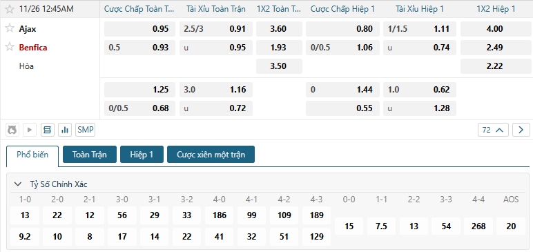 Bảng tỷ lệ kèo bóng đá trận đấu Ajax vs Benfica
