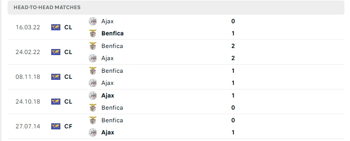 Những màn đụng độ giữa Ajax và Benfica thường diễn ra chặt chẻ với ít bàn thắng được tạo ra, cụ thể ở 4/5 lần gặp nhau gần nhất của hai đội và 3/4 lần đón tiếp Benfica trên sân của Ajax khép lại không quá 2 bàn, hàng công đang chơi tệ khiến Ajax và Benfica đang gặp nhiều khó khăn.