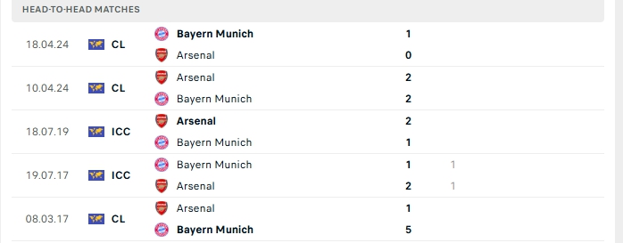 Những màn đụng độ giữa Arsenal và Bayern Munich thường diễn ra hấp dẫn với nhiều bàn thắng được tạo ra, cụ thể ở 3/5 lần gặp nhau gần nhất và 3/5 lần đón tiếp Bayern Munich trên sân của Arsenal khép lại trên 3 bàn.