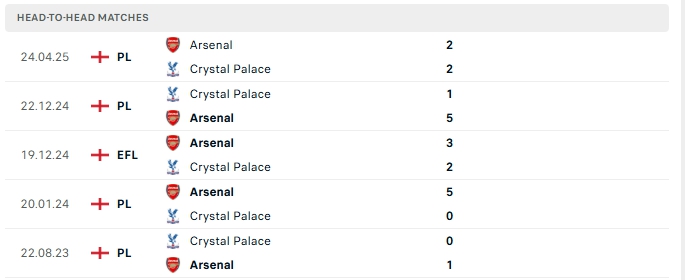 Phong độ gần đây Arsenal vs Crystal Palace