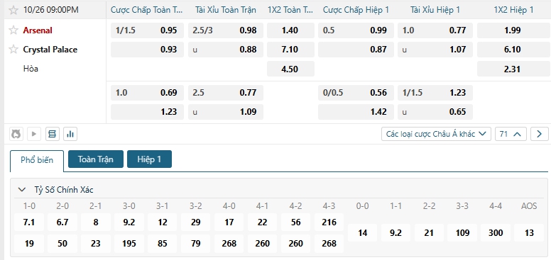Nhà cái châu Á đang đánh giá cao khả năng chiến thắng của chủ nhà Arsenal, khi đưa ra mức chấp đang là 1.25, có được ưu thế sân nhà sở hữu thực lực vượt trội, Arsenal sẻ là đội kiểm soát thế trận và hướng đến chiến thắng cho mình, dù vậy sẻ không phải là chiến thắng dễ dàng khi đối thủ của họ là Crystal Palace, các vị khách sở hữu lối chơi đầy khó chịu sẻ đem đến nhiều khó khăn cho chủ nhà, trong 5 lần chạm mặt gần nhất thì Arsenal chỉ có 2 lần tạo được chiến thắng cách biệt, lựa chọn Crystal Palce cho kèo châu Á.