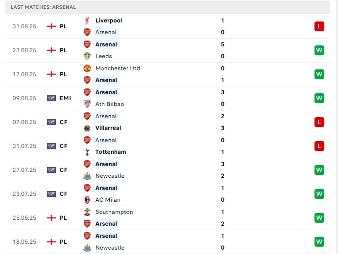 Arsenal ở 3 vòng đấu đầu tiên, họ mang về 2 chiến thắng và 1 thất bại, họ có được 6 điểm và đang xếp vị trí 3 trên BXH, ở trận ra quân Arsenal có được chiến thắng trước Man Utd, sau đó họ đè bẹp Leeds 5 bàn, sau đó họ nhận thất bại tối thiểu 0-1 trước Liverpool, phong độ thời gian qua trên sân nhà của Arsenal là khá tốt khi họ thắng 3 ở 5 trận vừa qua.