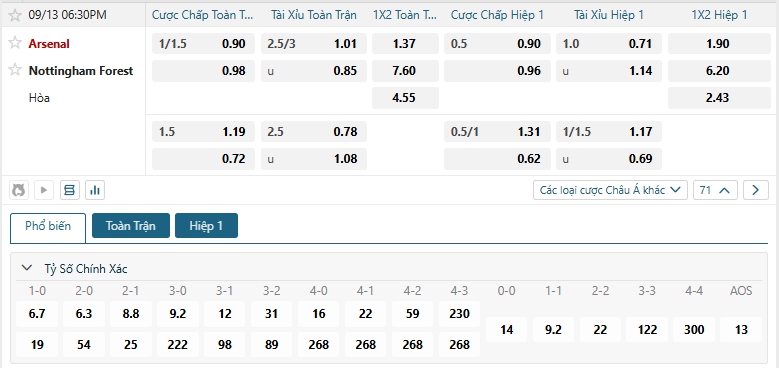 Nhà cái châu Á đang đánh giá cao khả năng chiến thắng của chủ nhà Arsenal là cao hơn nhiều, khi đưa ra mức chấp đang là 1.25, Arsenal sở hữu lối chơi ấn tượng, thực lực được đánh giá cao hơn, dù Nottingham Forest sẻ gây nhiều khó khăn cho các cầu thủ nhà khi họ sở hữu lối chơi khó chịu nhưng Arsenal vẫn hứa hẹn là đội có được chiến thắng với ưu thế sân bãi đang có, cùng lịch sử đối đầu ủng hộ khi 3 trong 5 chiến thắng trên sân nhà Arsenal đều có được cách biệt, lựa chọn Arsenal cho kèo châu Á.