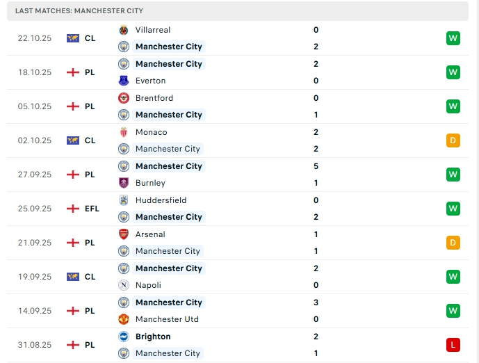Bên kia sân, Man City vừa có chiến thắng 2-0 trước Villarreal ở sân chơi Champions League, còn ở đấu trường quốc nội, ở vòng gần nhất The Citizens cũng mang về 3 điểm khi đánh bại Everton, sau 8 vòng đấu đoàn quân của HLV Pep có cho mình 5 chiến thắng, 1 hòa cùng 2 thất bại, có được 16 điểm và đang xếp thứ 2 trên BXH, kém 3 điểm so với đội dẫn đầu là Arsenal, phong độ thời gian qua của Man City là ấn tượng, họ bất bại ở 9 trận gần nhất với 7 chiến thắng cùng 2 hòa, khi thi đấu xa nhà Man City cũng chơi tốt với 3 chiến thắng, 2 hòa ở 5 trận đấu.
