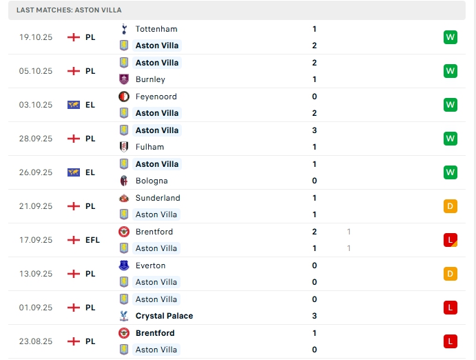 Aston Villa sau 8 trận đấu họ mang về 3 chiến thắng, 3 hòa cùng 2 thất bại, có được 12 điểm và đang xếp vị trí thứ 11 trên BXH, ở vòng đấu gần nhất đội chủ sân Villa Park có được chiến thắng 2-1 trước Tottenham, đây là trận thắng thứ 5 liên tiếp của họ trên mọi đấu trường, trên sân nhà của mình ở 5 trận gần nhất thì Aston Villa cũng có được 3 chiến thắng, 1 hòa cùng 1 thất bại.