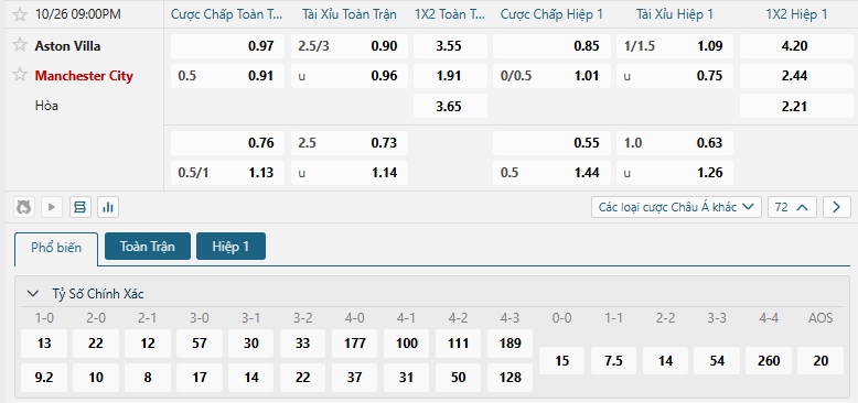Bảng tỷ lệ kèo bóng đá trận đấu Aston Villa vs Man City