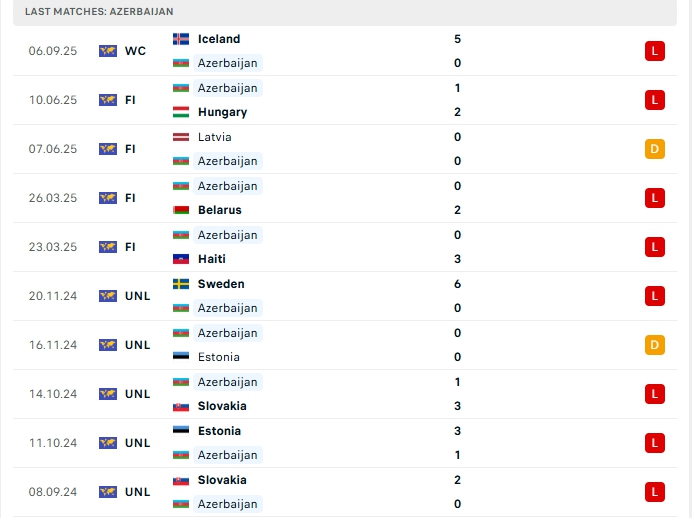 Azerbaijan ở trận ra quân hàng công chưa có bàn thắng nào, cùng với hàng thủ chơi tệ khi nhận đến 5 bàn thua, 3/5 trận vừa qua của Azerbaijan khép lại từ 3 bàn thắng trở lên, 3/5 trận trên sân nhà vừa qua của họ cũng tương tự, việc hàng thủ đang chơi thiếu chắc chắn khiến Azerbaijan đang gặp nhiều khó khăn.