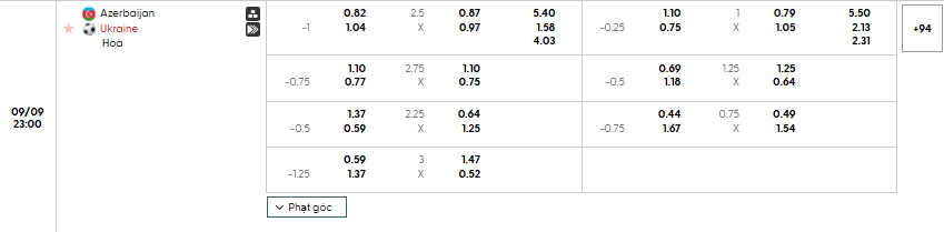 Bảng tỷ lệ kèo bóng đá trận đấu Azerbaijan vs Ukraina