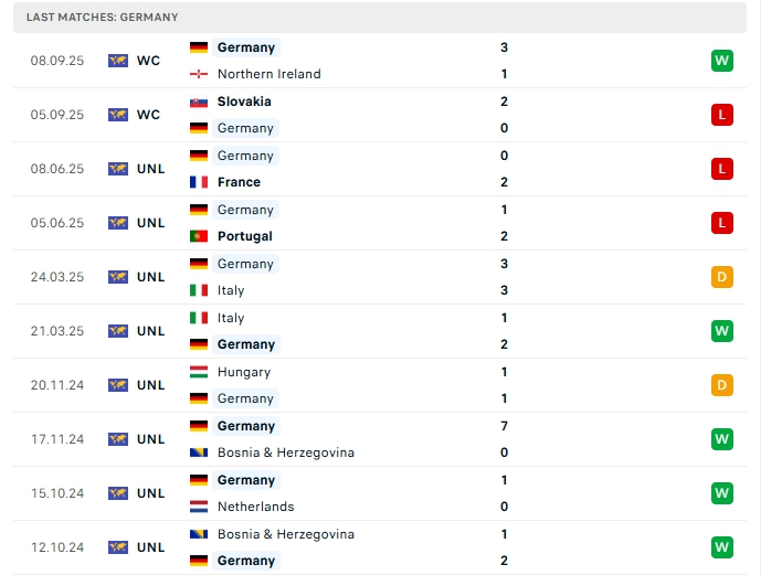 Đức sau 2 trận đấu, hàng công của đội bóng này mang về 3 bàn thắng cùng hàng thủ nhận 3 bàn thua, 3/5 trận gần nhất của tuyển Đức khép lại từ 3 bàn trở lên, khi thi đấu xa nhà đoàn quân của HLV Julian Nagelsmann có được 7 bàn thắng nhưng hàng thủ cũng nhận 7 bàn thua, cả 5 trận xa nhà tuyển Đức điều để các đối thủ chọc thủng lưới,
