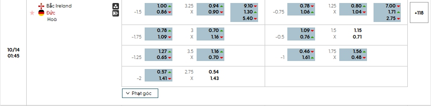Bảng tỷ lệ kèo bóng đá trận đấu Bắc Ireland vs Đức