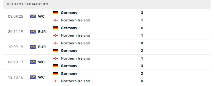 Những lần đụng độ giữa Bắc Ireland và Đức thường diễn ra hấp dẫn với nhiều bàn thắng được tạo ra, cụ thể ở 3/5 lần gặp nhau gần nhất của hai đội khép lại từ 3 bàn trở lên, trong đó có 3/5 lần đón tiếp Đức trên sân của Bắc Ireland cũng có kết quả tương tự.