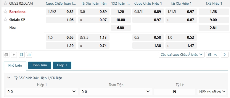 Bảng tỷ lệ kèo bóng đá trận đấu Barcelona vs Getafe