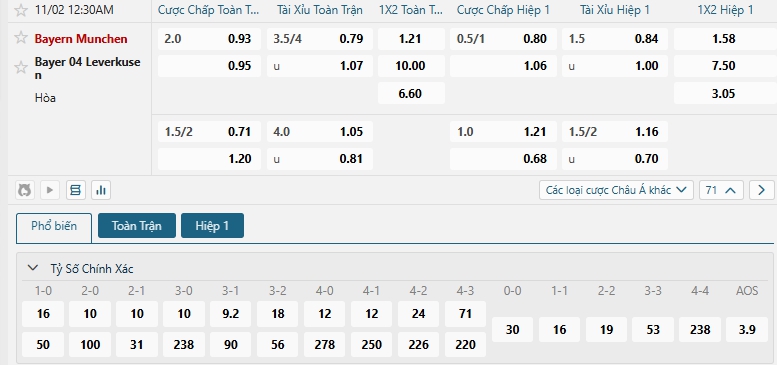Bảng tỷ lệ kèo bóng đá trận đấu Bayern Munich vs Bayer Leverkusen