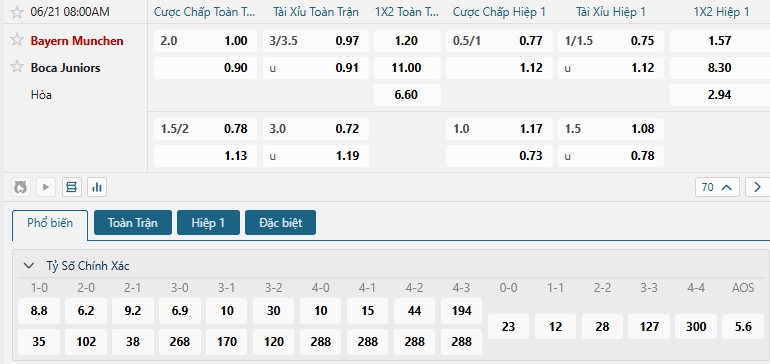 Bảng tỷ lệ kèo bóng đá trận đấu Bayern Munich vs Boca Juniors