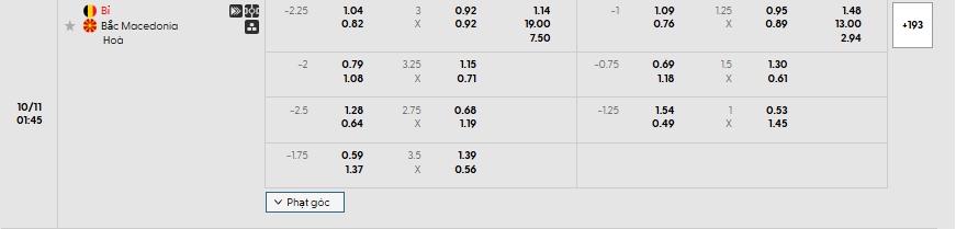Nhà cái châu Á đang đánh giá cao khả năng chiến thắng của Bỉ là cao hơn khi đưa ra mức chấp là 2.25, Bỉ được đánh giá cao hơn về thực lực nhưng chắc chắn sẻ gặp khó trước North Macedonia, đội bóng đang chơi tốt thời gian qua, Bỉ với ưu thế sân nhà sẻ hứa hẹn dồn ép và tìm kiếm chiến thắng cho mình, một chiến thắng khó cách biệt khi trong 5 lần gặp nhau gần nhất thì Bỉ chỉ có 1 lần có chiến thắng cách biệt trên 2 bàn, lựa chọn North Macedonia cho kèo châu Á.