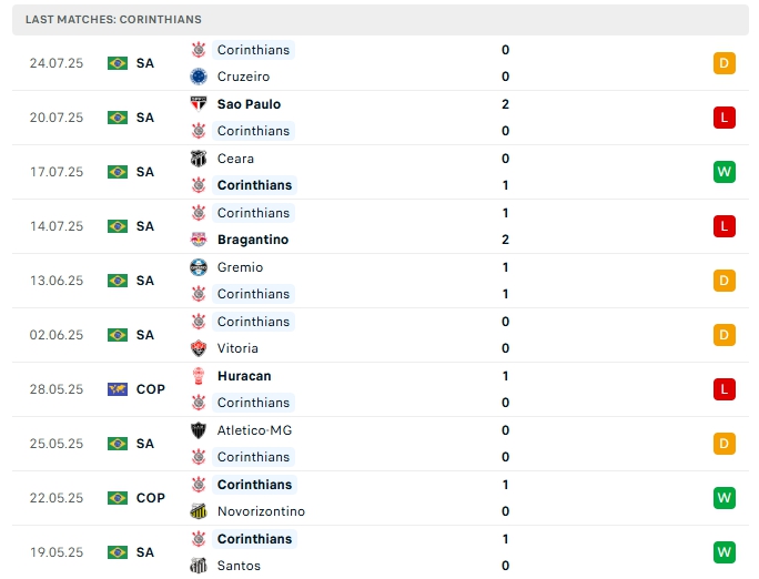 Corinthians sau 16 trận đấu hàng công của đội bóng này mang về 15 bàn thắng cùng hàng thủ nhận 19 bàn thua, 4/5 trận vừa qua của họ khép lại không quá 2 bàn thắng, khi thi đấu xa nhà ở 5 trận vừa qua của Corinthians cũng khép lại không quá 2 bàn.