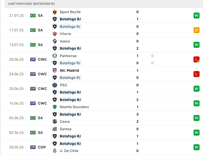 Botafogo sau 14 trận đấu họ mang về 17 bàn thắng cùng với hàng thủ cực kỳ chắc chắn khi chỉ nhận 7 bàn thua, lối chơi của Botafogo thiên về phòng ngự nên hiệu suất ghi bàn của hàng công là không tốt, cả 5 trận gần nhất của họ khép lại 90 phút không quá 2 bàn.