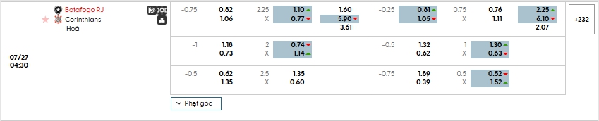 Bảng tỷ lệ kèo bóng đá trận đấu Botafogo vs Corinthians