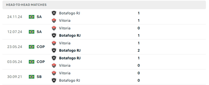 Những màn đụng độ giữa Botafogo và  Vitoria/BA thường diễn ra chặt chẻ với ít bàn thắng được tạo ra, cụ thể ở 4/5 lần gặp nhau gần nhất của hai đội và 4/5 lần đón tiếp Vitoria/BA trên sân của Botafogo khép lại không quá 2 bàn.