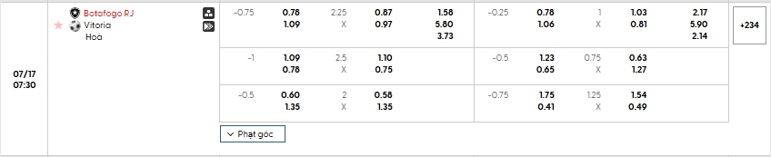 Nhà cái Châu Á đang đánh giá khả năng chiến thắng của Botafogo là cao hơn khi đưa ra mức chấp là 0.75, với ưu thế sân nhà nơi mà Botafogo đang chơi tốt, họ tự tin tìm kiếm chiến thắng trước đối thủ, Vitoria đang chơi tệ khi xa nhà chắc chắn sẻ gặp nhiều khó khăn trước chủ nhà, lựa chọn Botafogo cho kèo Châu Á.