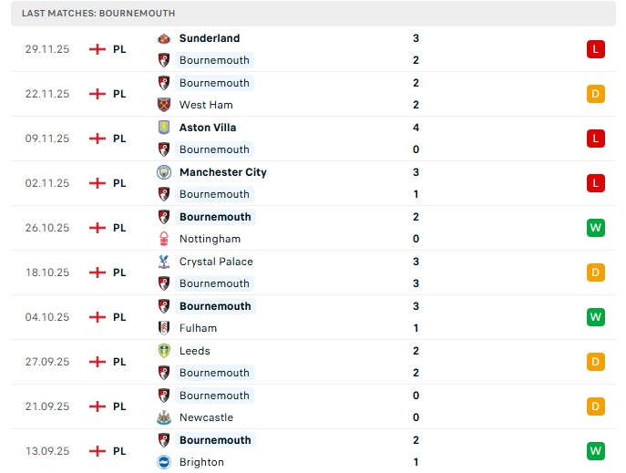 Bournemouth sau 13 lượt trận, hàng công của đội bóng này mang về 21 bàn thắng cùng hàng thủ nhận 23 bàn thua, 4/5 trận vừa qua của Bournemouth ở đấu trường Ngoại Hạng Anh khép lại trên 3 bàn thắng, việc hàng thủ đang chơi tệ khiến Bournemouth đang gặp nhiều khó khăn, trên sân nhà ở 3/5 trận gần nhất của Bournemouth cũng có kết quả tương tự.