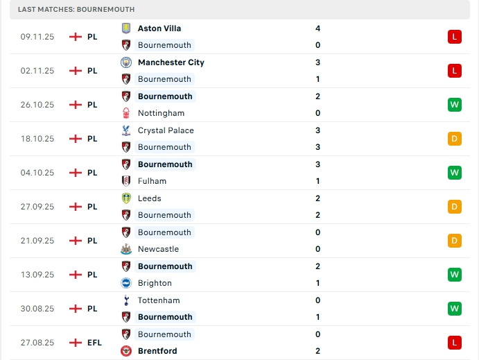 Bournemouth sau 11 trận đấu họ mang về 5 chiến thắng, 3 hòa cùng 3 thất bại, có được 18 điểm và đang xếp vị trí thứ 9 trên BXH, ở vòng đấu gần nhất Bournemouth nhận thất bại 0-4 trước Aston Villa, đây là trận thua thứ 2 liên tiếp của Bournemouth, phong độ thời gian qua của Bournemouth là không tốt, dù vậy trên sân nhà Bournemouth đang có phong độ tốt với 3 chiến thắng, 1 hòa ở 4 trận gần nhất.