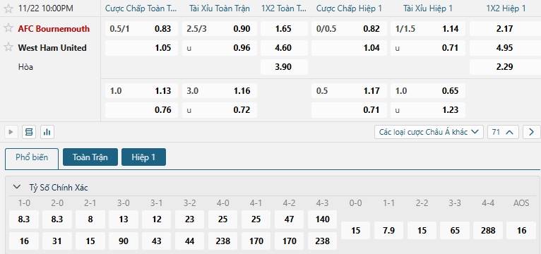 Bảng tỷ lệ kèo bóng đá trận đấu Bournemouth vs West Ham Utd