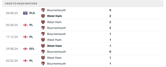 Lịch sử đối đầu của Bournemouth vs West Ham Utd