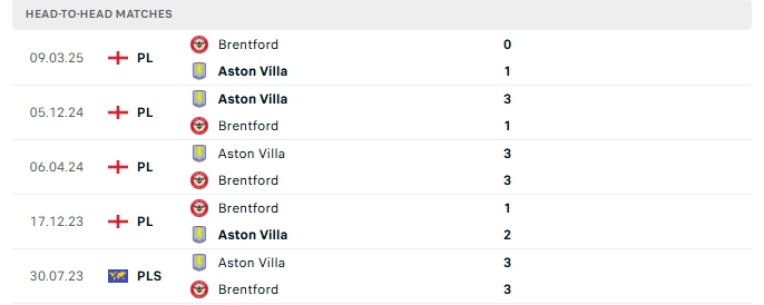 Phong độ gần đây Brentford vs Aston Villa