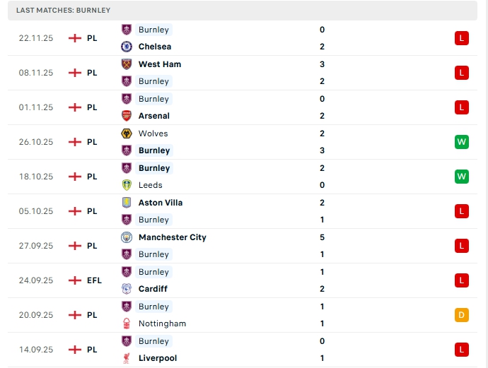 Burnley ở 12 lượt trận đội bóng này có được 14 bàn thắng cùng hàng thủ chơi tệ khi nhận đến 24 bàn thua, 4/5 trận gần nhất Burnley đều để các đối thủ chọc thủng lưới, khi xa nhà ở cả 5 trận vừa qua của Burnley đều khép lại trên 3 bàn thắng.