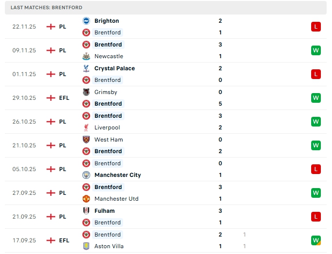 Brentford sau 12 trận đấu họ mang về 5 chiến thắng, 1 hòa cùng 6 thất bại, có được 16 điểm và đang xếp vị trí thứ 13 trên BXH, ở vòng đấu gần nhất Brentford nhận thất bại 1-2 trước Brighton, đây là thất bại thứ 2 của họ ở 3 trận gần nhất, nhưng tính rộng ra bầy ong thắng 3 và thua 2 ở 5 trận vừa qua,  phong độ thời gian qua trên sân nhà của Brentford là khá tốt với với 4 chiến thắng, 1 thất bại ở 5 trận gần nhất.