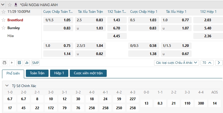 Bảng tỷ lệ kèo bóng đá trận đấu Brentford vs Burnley