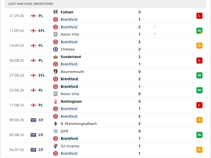 Brentford sau 5 trận đấu họ mang về 1 chiến thắng, 1 hòa, cùng 3 thất bại, có được 4 điểm và đang xếp vị trí thứ 17 trên BXH, trận thua trước Fulham vừa qua nối dài chuỗi 3 trận liên tiếp không biết đến mùi chiến thắng, phong độ thời gian qua của Brentford là không tốt, dù có ưu thế sân nhà nhưng họ sẻ gặp khó ở trận đấu tới.