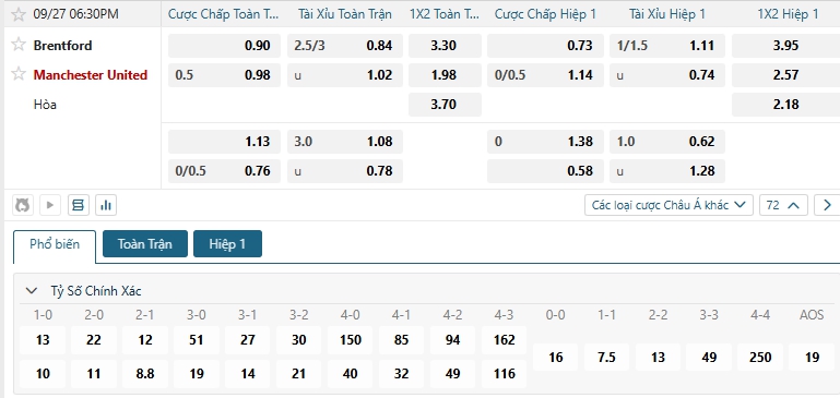 Bảng tỷ lệ kèo bóng đá trận đấu Brentford vs Man Utd