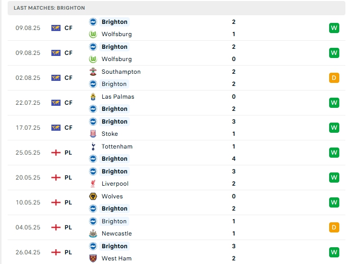 Brighton đang có được sự chuẩn bị kỹ càng cho mùa giải mới, với chuỗi 5 trận giao hữu liên tiếp và mang về thành tích đáng khen khi bất bại trong đó có 4 chiến thắng và 1 hòa, trên sân nhà của mình họ cũng đang chơi tốt với 4 chiến thắng liên tiếp, Brighton hứa hẹn sẻ có mở đầu ấn tượng ở mùa giải năm nay.