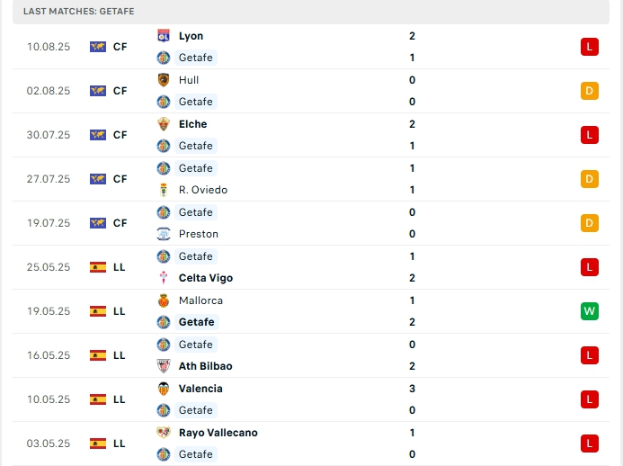 Getafe kết thúc mùa giải ở vị trí thứ 13 trên BXH với 42 điểm, họ ghi được 34 bàn thắng để thủng lưới 39 bàn thua, lối chơi của Getafe thiên về phòng ngự, để chuẩn bị cho mùa giải mới họ có cho mình 5 trận giao hữu, trong 5 trận đó hàng công có được 3 bàn thắng, cùng hàng thủ nhận 5 bàn thua, 3/5 trận đấu đó khép lại không quá 2 lần lưới rung.