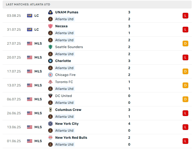 Bên kia sân, Atlanta United vừa thua 2 trận liên tiếp ở sân chơi Leagues Cup, còn ở đấu trường MLS ở vòng đấu gần nhất họ có trận hòa trước Seattle Sounders, sau 24 trận đấu với 4 chiến thắng, 9 hòa và 11 thất bại, có được 21 điểm và đang xếp vị trí thứ 13 trên BXH, hơn đối thủ trong trận đấu này 3 điểm, phong độ thời gian qua của Atlanta United cũng không tốt khi họ chưa có chiến thắng nào ở 10 trận gần nhất trên mọi đấu trường, khi thi đấu xa nhà Atlanta United cũng chơi tệ với chuỗi 13 trận không thắng.