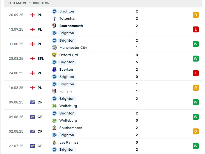 Brighton sau 5 trận đấu của mùa giải năm nay mang về 6 bàn thắng nhưng hàng thủ nhận 8 bàn thua, 3/5 trận vừa qua khép lại từ 3 bàn thắng trở lên, khi thi đấu xa nhà ở 3/5 trận gần nhất của họ cũng vượt mốc 3 bàn, lối chơi của Brighton thường rất cởi mở nên những trận có sự góp mặt của họ đều đầy hứa hẹn.