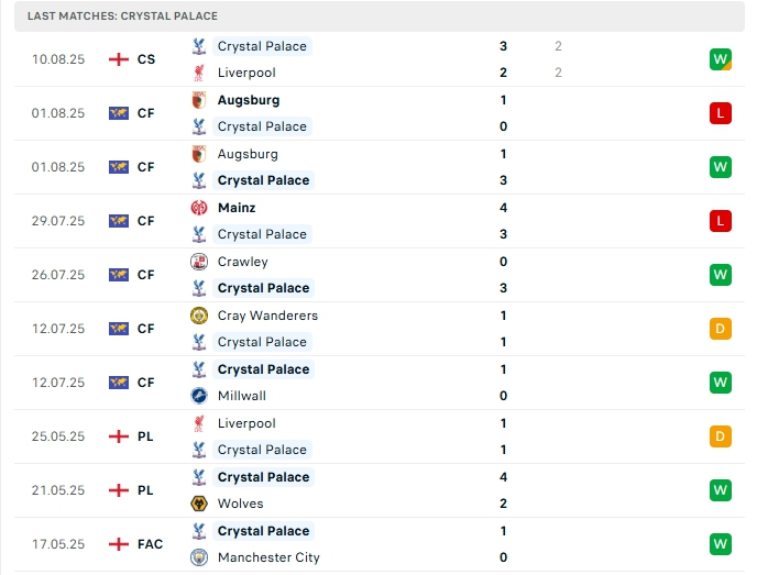 Crystal Palace kết thúc mùa giải ở vị trí thứ 12 tại Premier League với 53 điểm, cùng hiệu số +0, họ ghi được 51 bàn thắng nhưng cũng để thủng lưới 51 bàn thua, Crystal Palace có cho mình 6 trận giao hữu vừa qua, hàng công có được 12 bàn thắng cùng hàng thủ nhận 7 bàn thua, ở trận đấu chính thức gần nhất họ đánh bại Liverpool ở loạt sút luân lưu để lên ngôi vô địch ở sân chơi Siêu cup Anh.