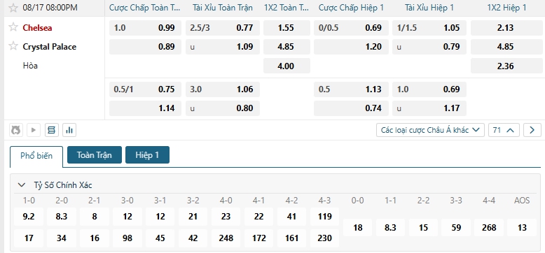 Nhà cái châu Á đang đánh giá cao khả năng chiến thắng của chủ nhà Chelsea là cao hơn so với Crystal Palace, khi đưa ra mức chấp đang là 1.0, ưu thế sân nhà, phong độ ấn tượng thời gian qua, Chelsea đang được đánh giá cao, The Blues sẻ gặp không ít khó khăn trước Crystal Palace ở ngày khai màn, nhưng Chelsea hứa hẹn vẫn có chiến thắng, dù sẻ không phải là chiến thắng cách biệt, lựa chọn Chelsea với mức chấp ở kèo phụ là 0.75.