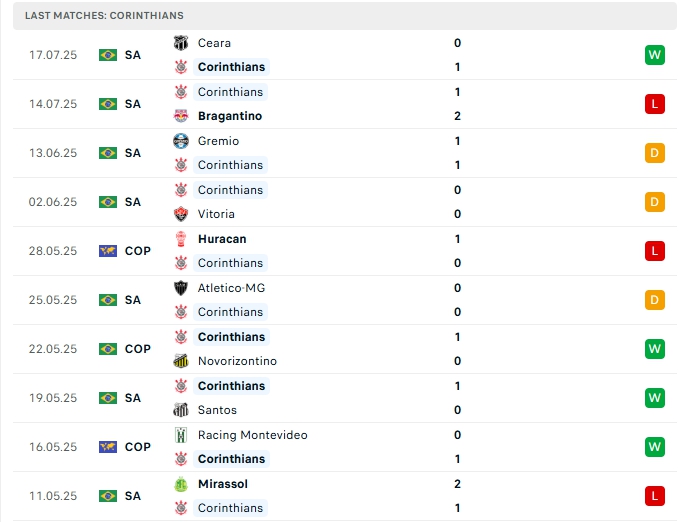 Corinthians sau 14 trận đấu hàng công của đội bóng này mang về 15 bàn thắng cùng hàng thủ nhận 17 bàn thua, 4/5 trận vừa qua của họ khép lại không quá 2 bàn thắng, trên sân nhà của mình ở 4/5 trận gần nhất của họ cũng có kết quả tương tự, việc hàng thủ đang chơi chắc chắn nên những trận đấu của Corinthians thường diễn ra với sự chặt chẻ và đầy toan tính.