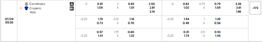 Bảng tỷ lệ kèo bóng đá trận đấu Corinthians vs Cruzeiro