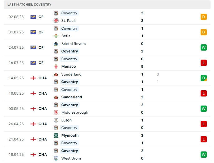 Coventry có cho mình 4 trận giao hữu trước thềm mùa giải mới, thành tích họ mang về với 1 chiến thắng, 2 hòa và 2 thất bại, 3 trận trên sân nhà họ chưa thể có chiến thắng khi hòa 2 và thua 1, dù vậy những đối thủ mà Coventry chạm trán được đánh giá cao, Coventry ở trận ra quân có được ưu thế sân bãi, họ đang tự tin hướng đến kết quả tốt.