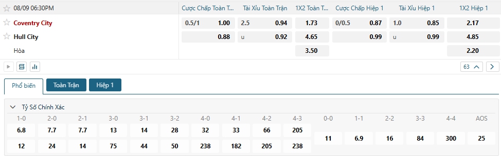 - Chọn Coventry -0.75 (Full-Time)