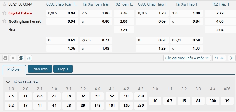 Bảng tỷ lệ kèo bóng đá trận đấu Crystal Palace vs Nottingham Forest