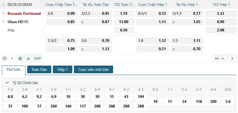 Bảng tỷ lệ kèo bóng đá trận đấu Dortmund vs Ulsan Hyundai