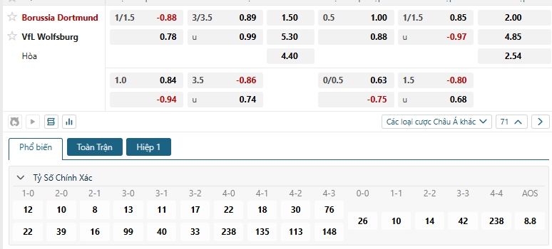 Bảng tỷ lệ kèo bóng đá trận đấu Dortmund vs Wolfsburg