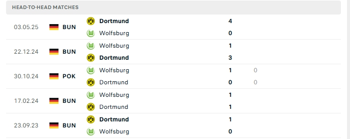 Những màn đụng độ giữa Dortmund và Wolfsburg thường diễn ra hấp dẫn với nhiều bàn thắng được tạo ra, cụ thể ở 2lần gặp nhau gần nhất và 3/5 lần đón tiếp Wolfsburg trên sân của Dortmund khép lại trên 3 bàn.