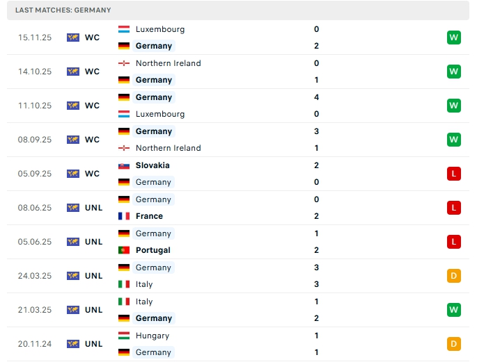Đức sau 5 lượt họ có cho mình 4 chiến thắng, cùng 1 thất bại, có được 12 điểm và đang dẫn đầu trên BXH, Đức ở trận gần nhất họ có chiến thắng 2-0 trước Luxembourg, đây là trận thắng thứ 4 liên tiếp, trên sân nhà Đức cũng toàn thắng ở 2 lượt trận vừa qua, Đức được đánh giá cao về thực lực nên chắc chắn sẻ hướng đến chiến thắng cho mình.