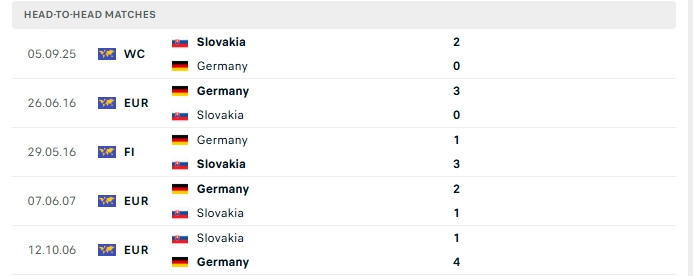 Những màn đụng độ giữa Đức và Slovakiathường diễn ra hấp dẫn với nhiều bàn thắng được tạo ra, cụ thể 4/5 lần gặp nhau gần nhất khép lại từ 3 bàn trở lên và cả 3 lần đón tiếp Slovakia trên sân của Đức khép lại trên 3 bàn.